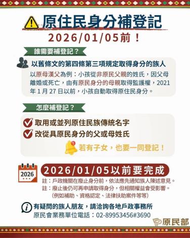 依據舊條文取得身分者才須補登記,若期限內未辦,經戶所催告後仍未申請者,逕為廢止原住民身分後仍能再申請取得身分,但相關權益會受影響(例如:補助、資格認定、法律扶助案件等等)